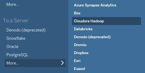 This means that the Tableau Connector for Hadoop is built using ODBC. So, when connecting to Cloudera Hadoop through Tableau Desktop, you’ll need to install the corresponding ODBC driver.