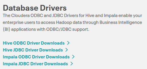 For example, when connecting to Cloudera Hadoop (Hive or Impala), the database provides both ODBC and JDBC drivers.