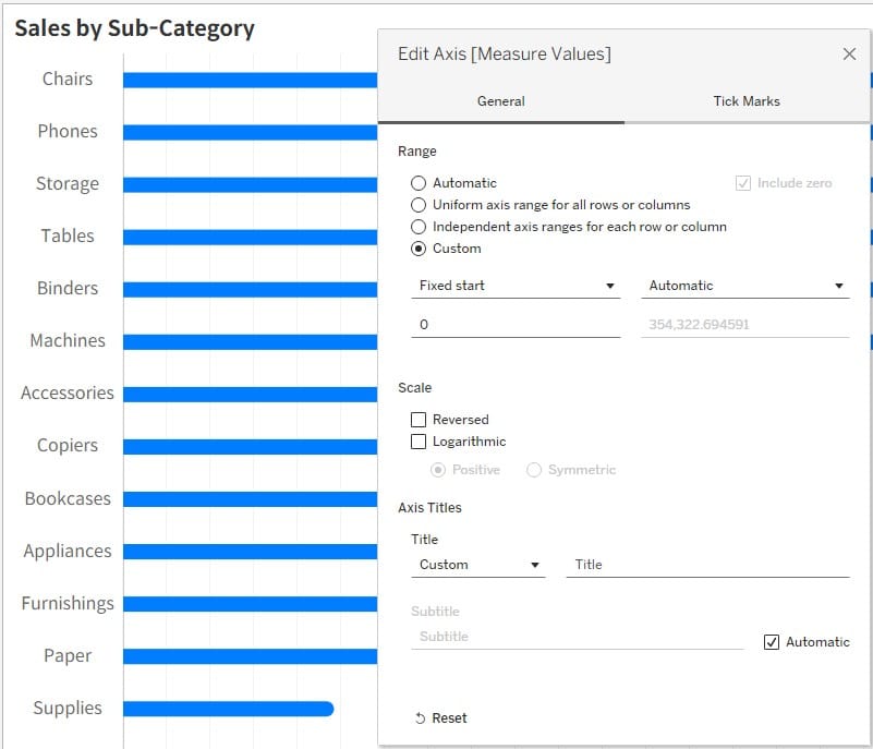 - Set up the fields for your bar chart. In this example, we’ll use Sales by Sub-Category.