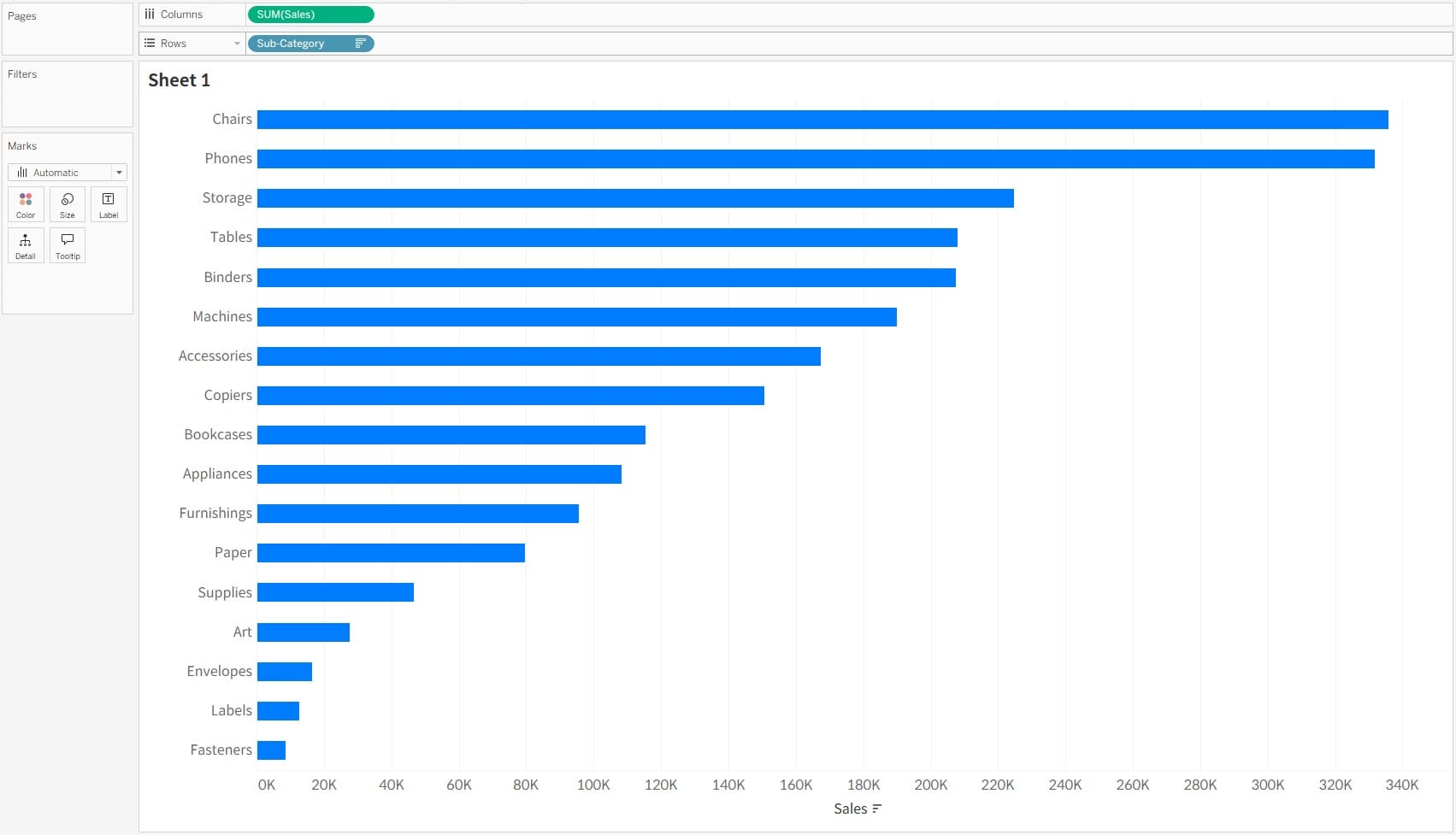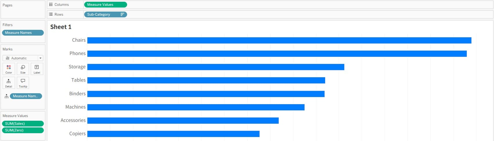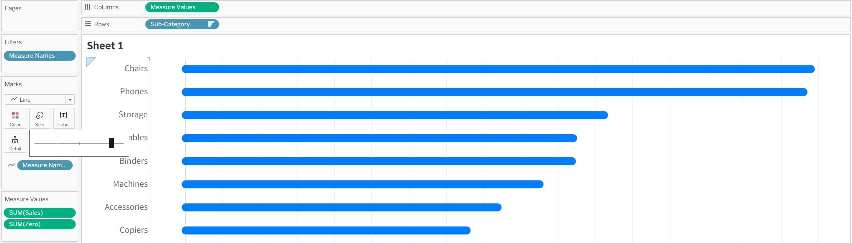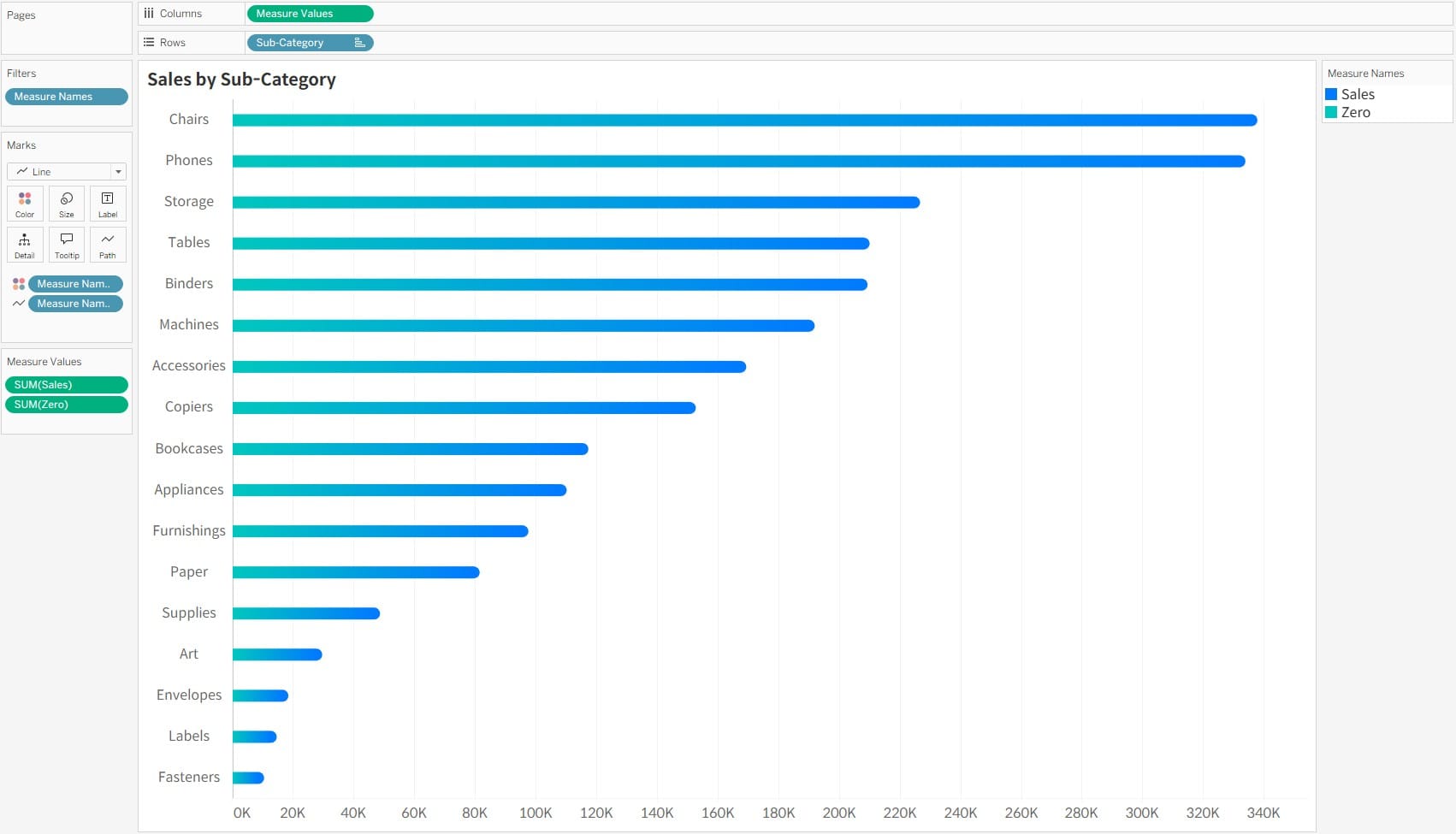 on the Path shelf. This will draw a line between each sub-category’s sales value and zero. Increasing the line size will make it look like a bar.