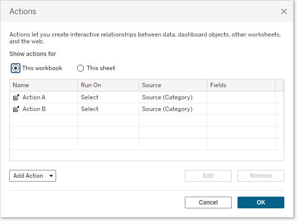 When setting up dashboard actions in Tableau, you might sometimes create multiple actions with the same trigger condition. For example, both actions may filter by the Category field, but each targets a different dashboard.