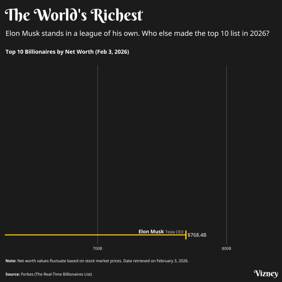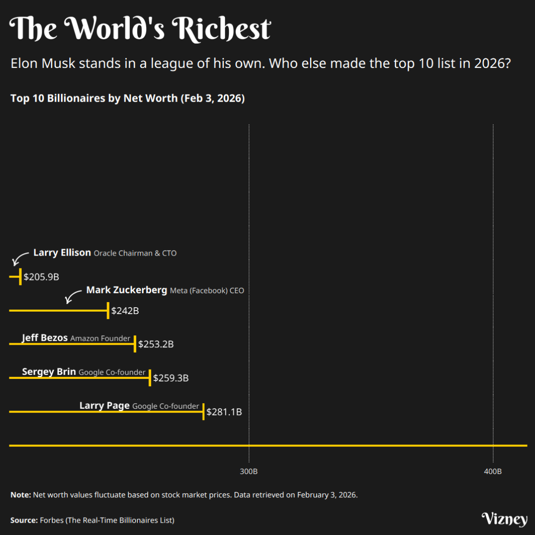 We visualized the top 10 billionaires based on Forbes' Real-Time Billionaires List as of February 3, 2026.