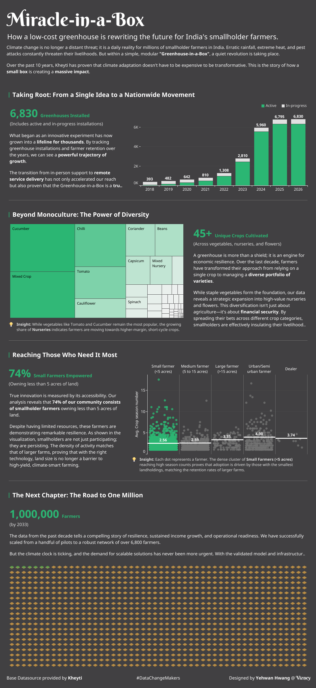 This dashboard covers how the greenhouse kits from the Indian agricultural innovation startup 'Kheyti' have changed farmers' lives. We utilized the scrolling flow to narrate the journey from the problem to the solution's impact, aiming to deliver the social value and emotion hidden behind the data.